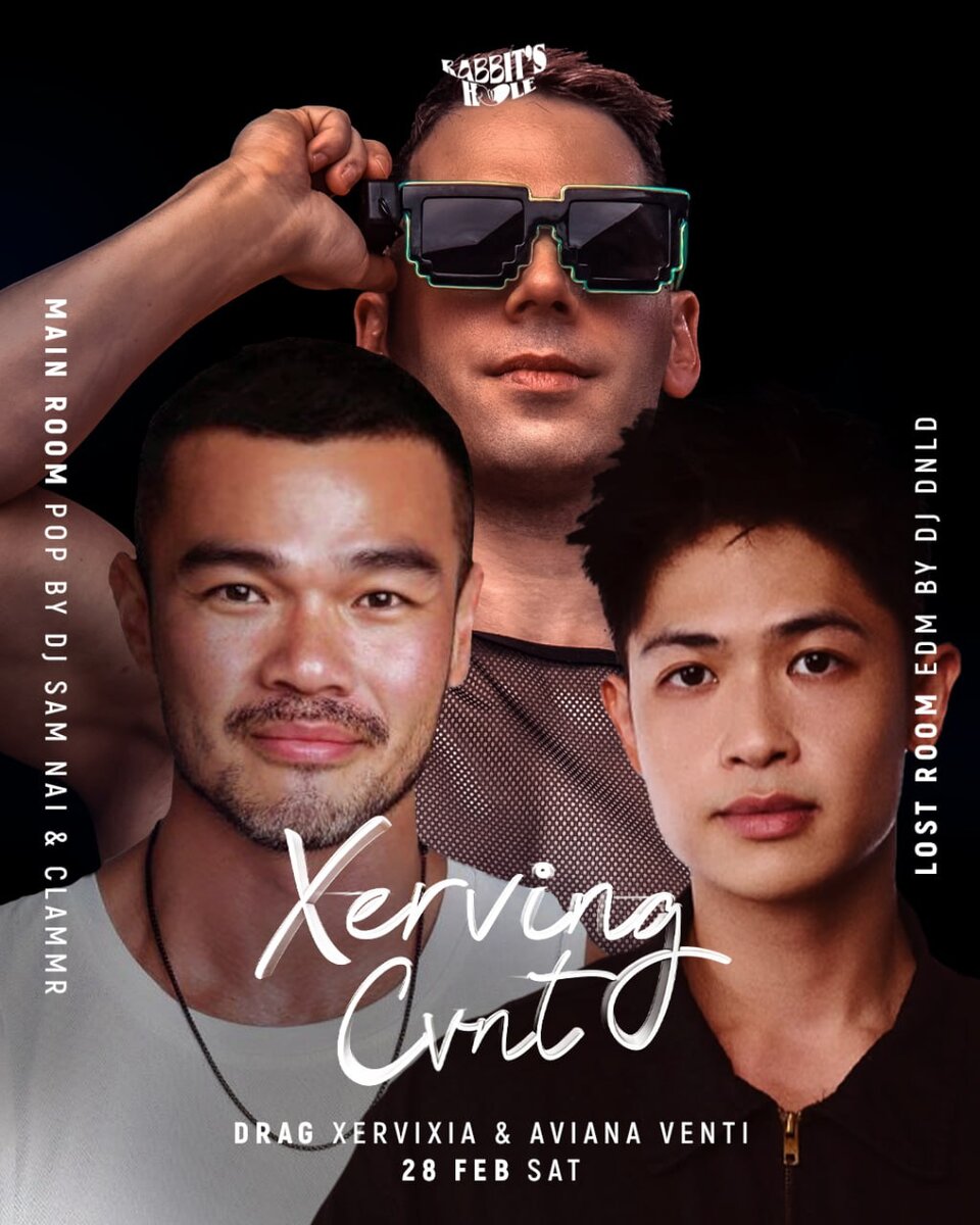 Xerving Cvnt at Rabbitβs Hole! I was on EDM duties in the Lost Room from 1am to 4am, with drag performances by Xervixia & Aviana Venti, and DJ Sam Nai & Teaspoon holding down the Main Room with pop.
